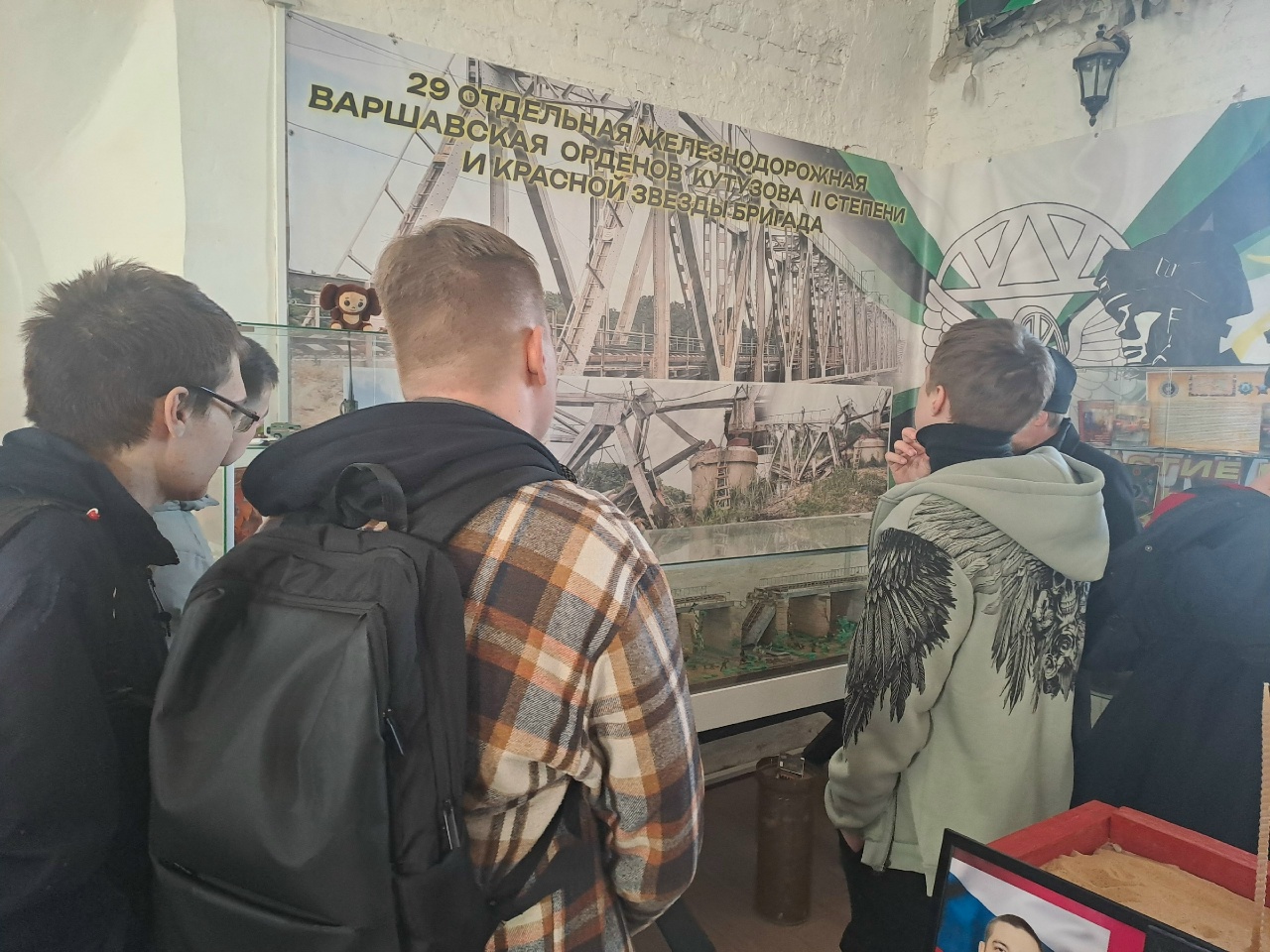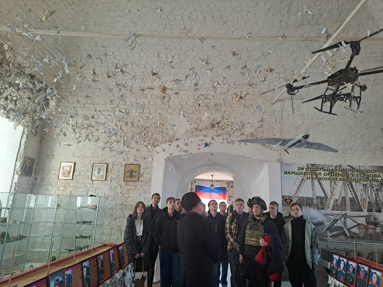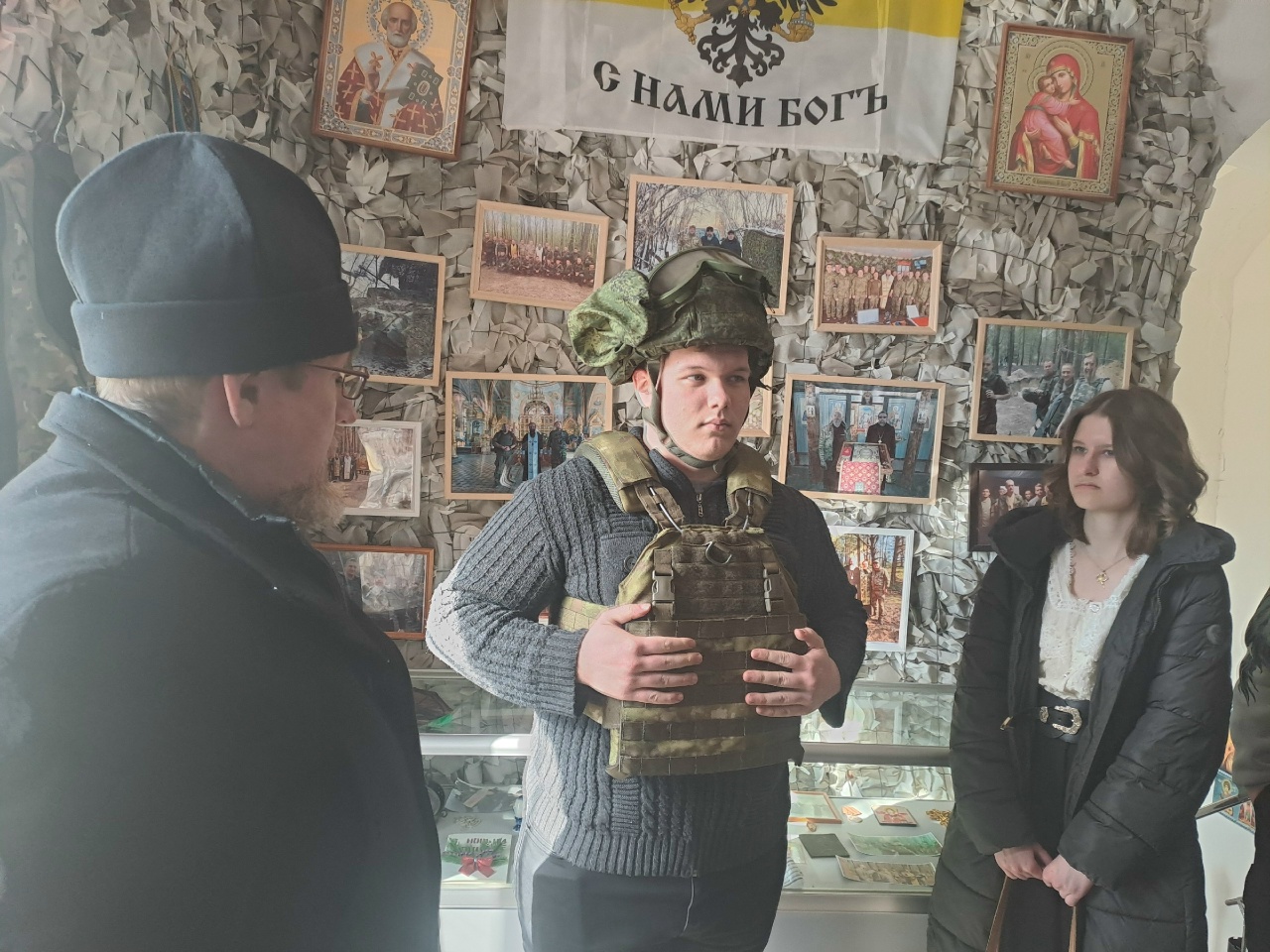Затем настоятель показал студентам экспозицию, посвященную СВО, которая расположена на втором этаже храма, и подробно рассказал о своем опыте служения в качестве военного священника.