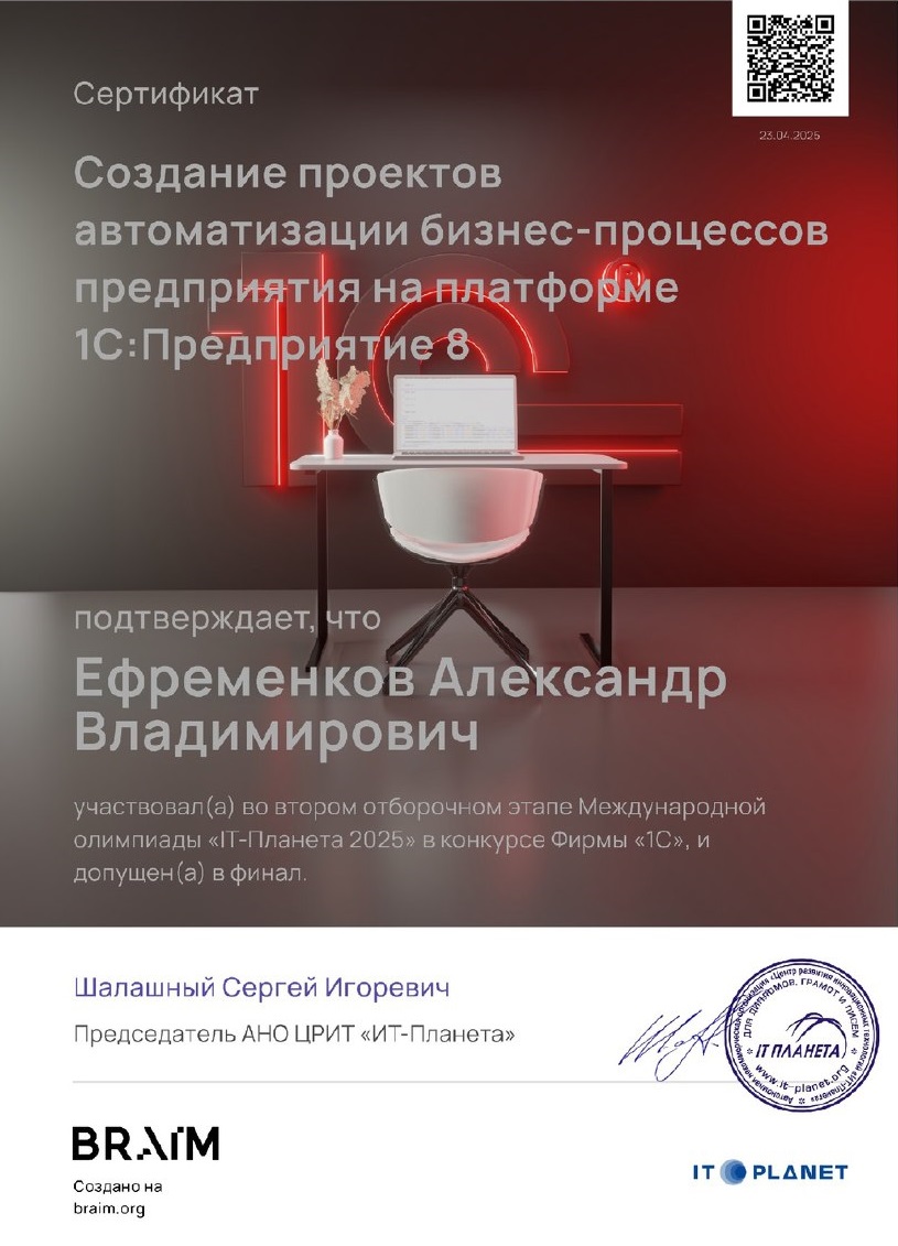 Студент филиала Ефременков А.В. прошел в финал Международной олимпиады «IT-Планета 2025» по направлению 1C: Предприятие 8.