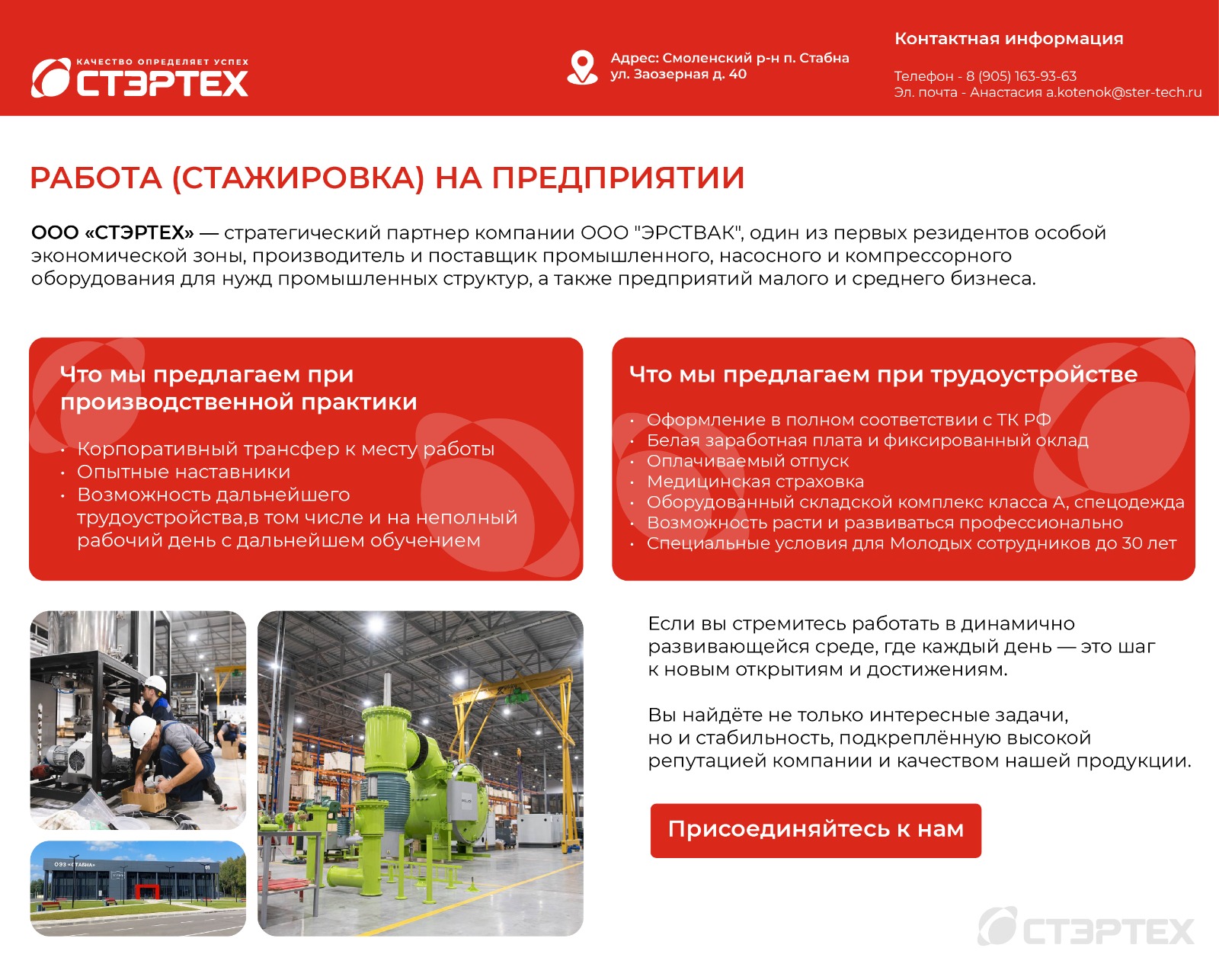 Компания СТЭРТЕХ приглашает на производственную практику и стажировку