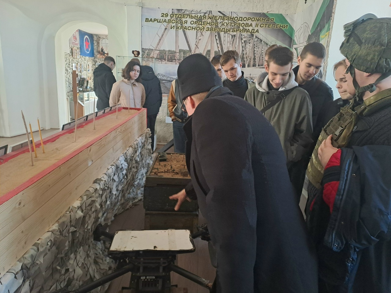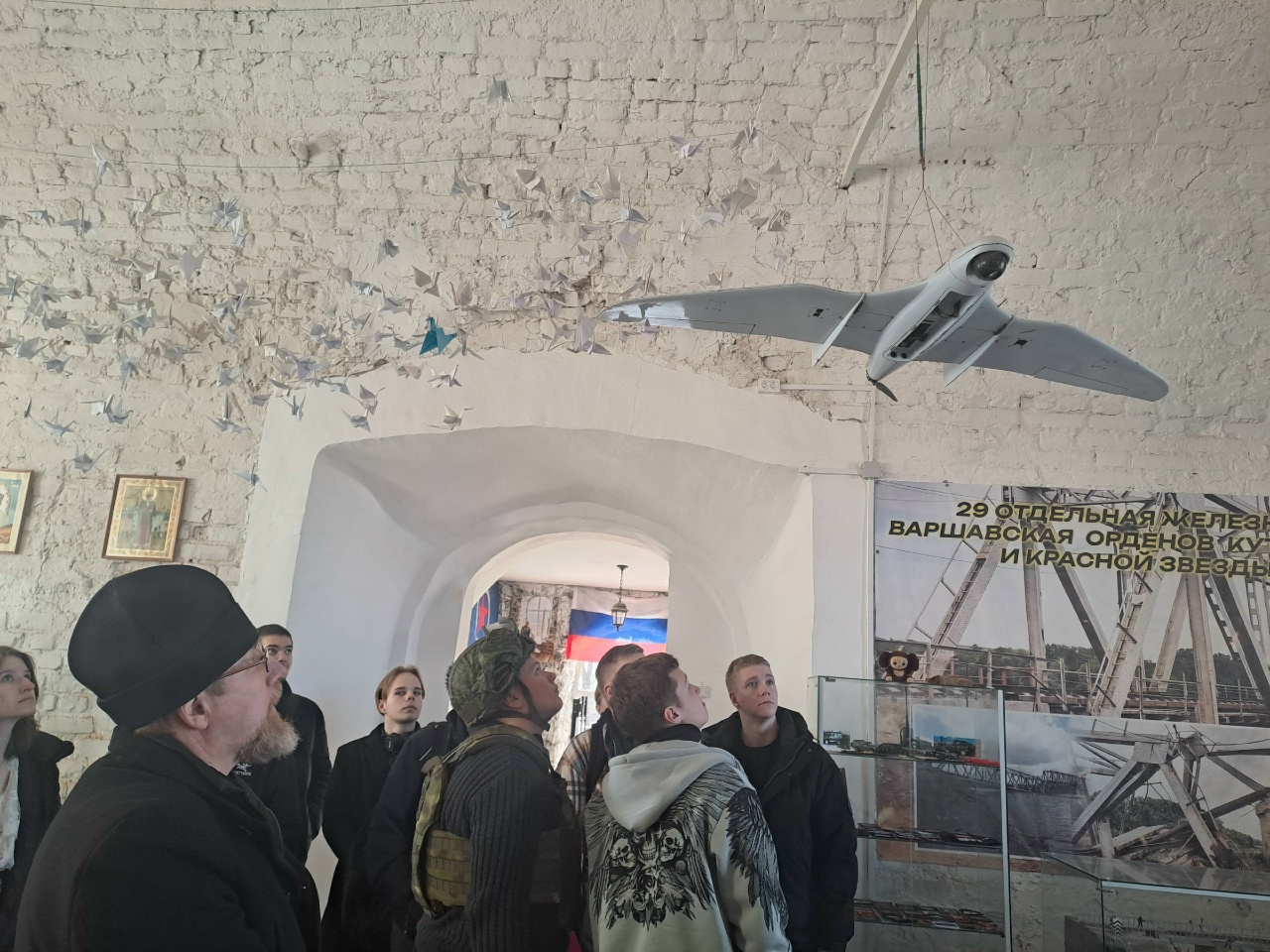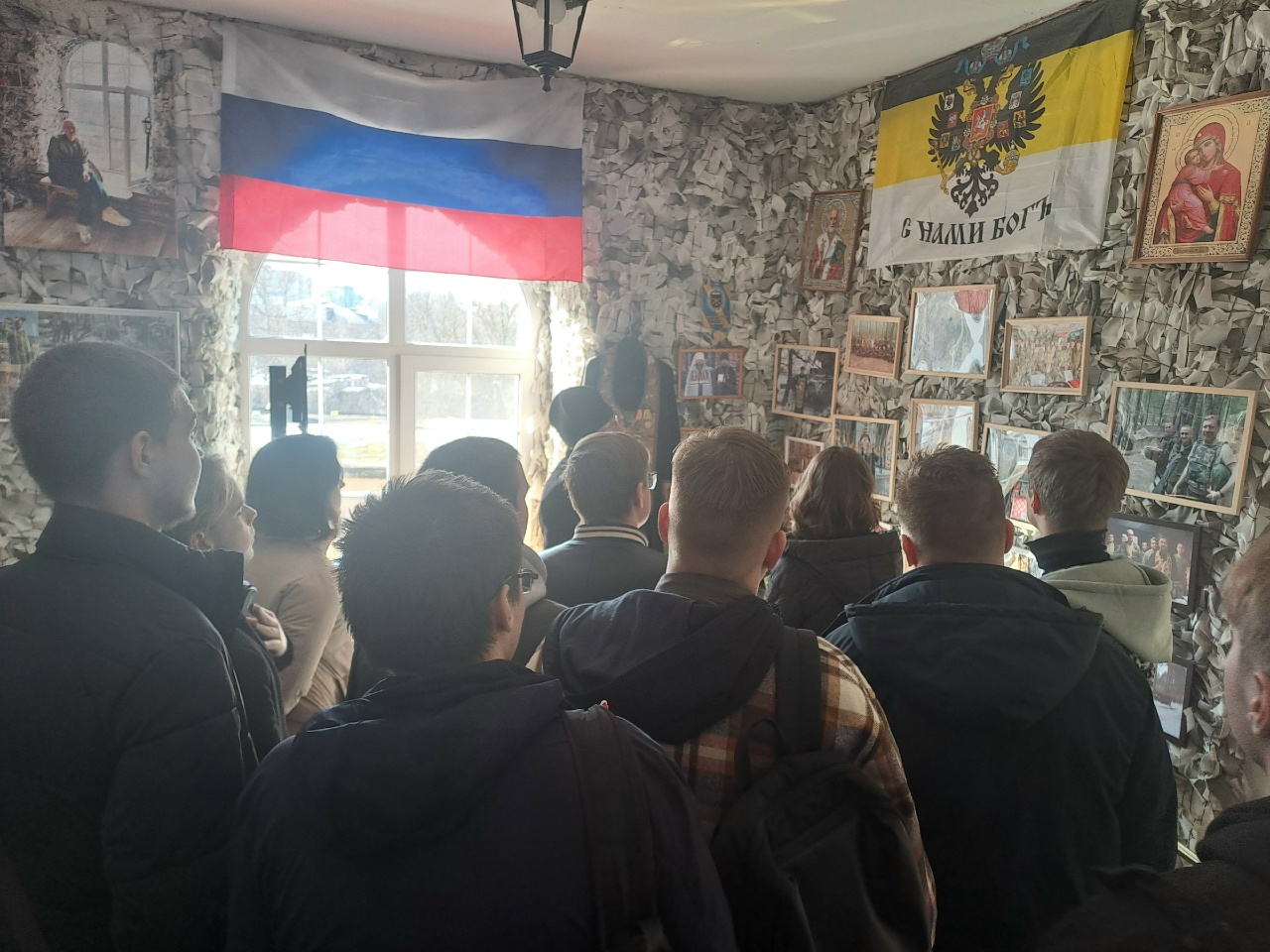 Затем настоятель показал студентам экспозицию, посвященную СВО, которая расположена на втором этаже храма, и подробно рассказал о своем опыте служения в качестве военного священника.